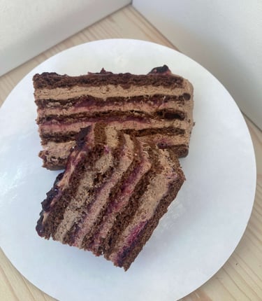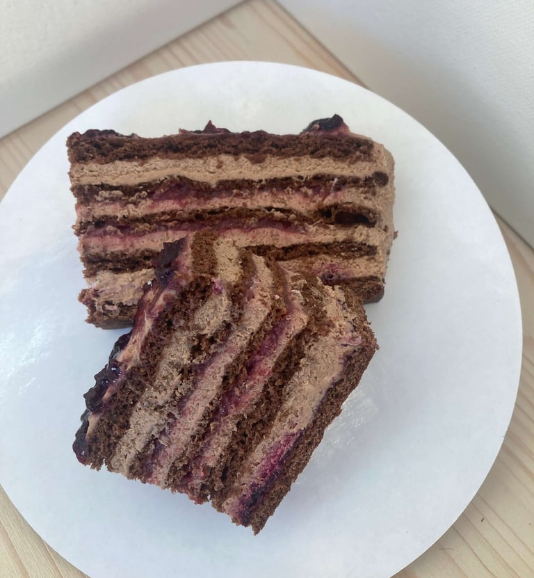 sudėtis Ploni kakaviniai lakštai su natūraliu medumi, lengvai šokoladinis sūrio kremas ir juodųjų serbentų pertepimai.